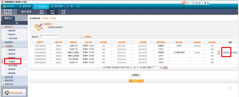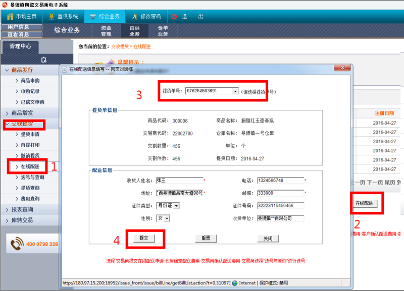 交收提貨---在線配送---在線配送---選擇提貨單號提交