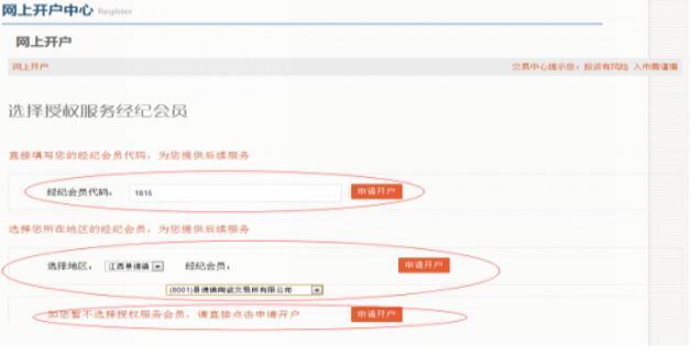 3、點擊“網上開戶”進入選擇:(方式一:若您有為自己服務的經紀會員,可以直接輸入代碼,點擊申請開戶;方式二:自行選擇經紀會員,點擊選擇地區,選擇經紀會員,申請開戶;方式三:直接點擊申請開戶)