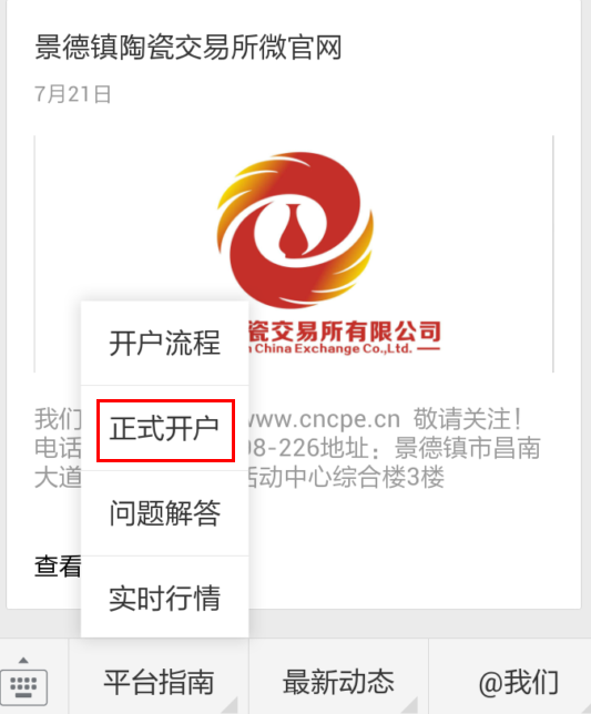 2、持有平安銀行卡或已開通平安易寶用戶請進入微信公眾號(景德鎮陶瓷交易所有限公司),在底部找到‘平臺指南->正式開戶’: