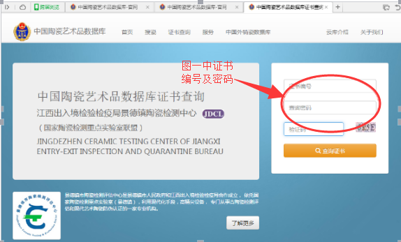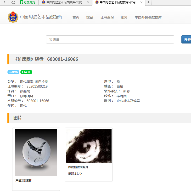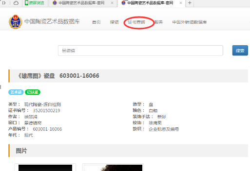2、進入中國陶瓷藝術品數據庫官網頁面,在圖二的選中區域輸入圖一中產品編號后五位數字“16066”,即可檢索到該編號產品可供對外查詢信息(每個產品對外可查詢一個體視顯微鏡照片數據)